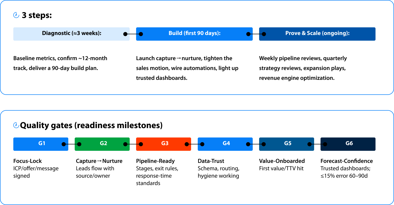 The Diagnostic sometimes finds a prerequisite. In that case, we’ll run a short FOCUS Sprint (Offer-Market Fit) or a Marketing OS Build to get capture→nurture live. Then we move straight into the Revenue Engine.